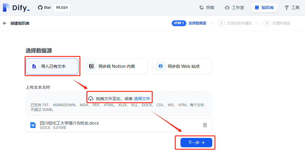 目前Dify支持三种数据源,文本文件、notion同步和网站爬虫同步,本指南以本地的文本文件为例,另外两种方式需要接入应用,有指定需求的老师可以自行尝试。首先将需要上传的文件进行导入: